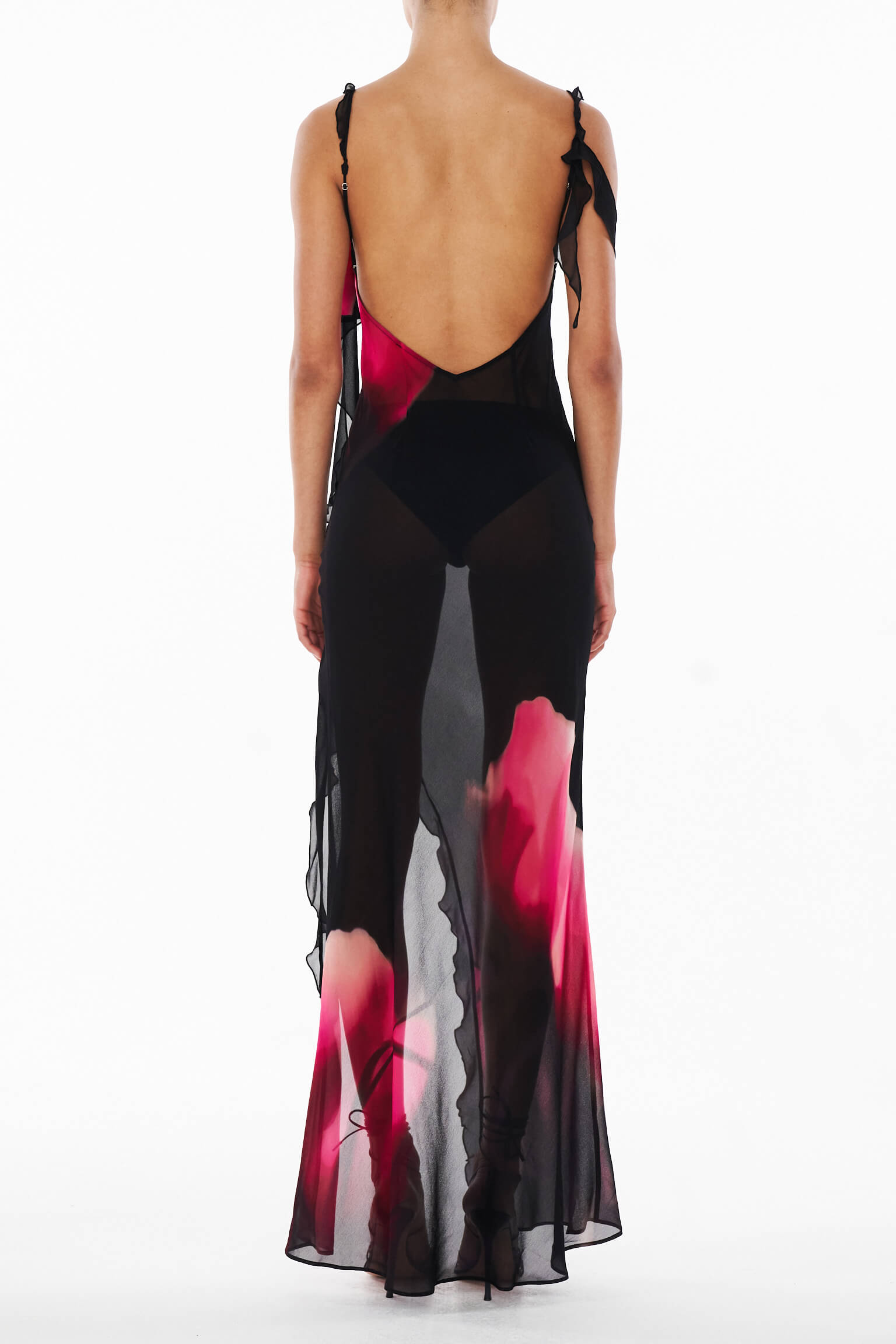 Powerfully feminine and made for impact, the Aurelia maxi is a effortlessly sexy occasion dress finished with delicate frills. Crafted from a luxurious, daringly sheer black georgette and printed with oversized tulips in a deep shade of pink, it's elevated with a double cowl neckline, a deep scooped back and a slit skirt and finished with romantic shoulder cuffs and delicate ties.