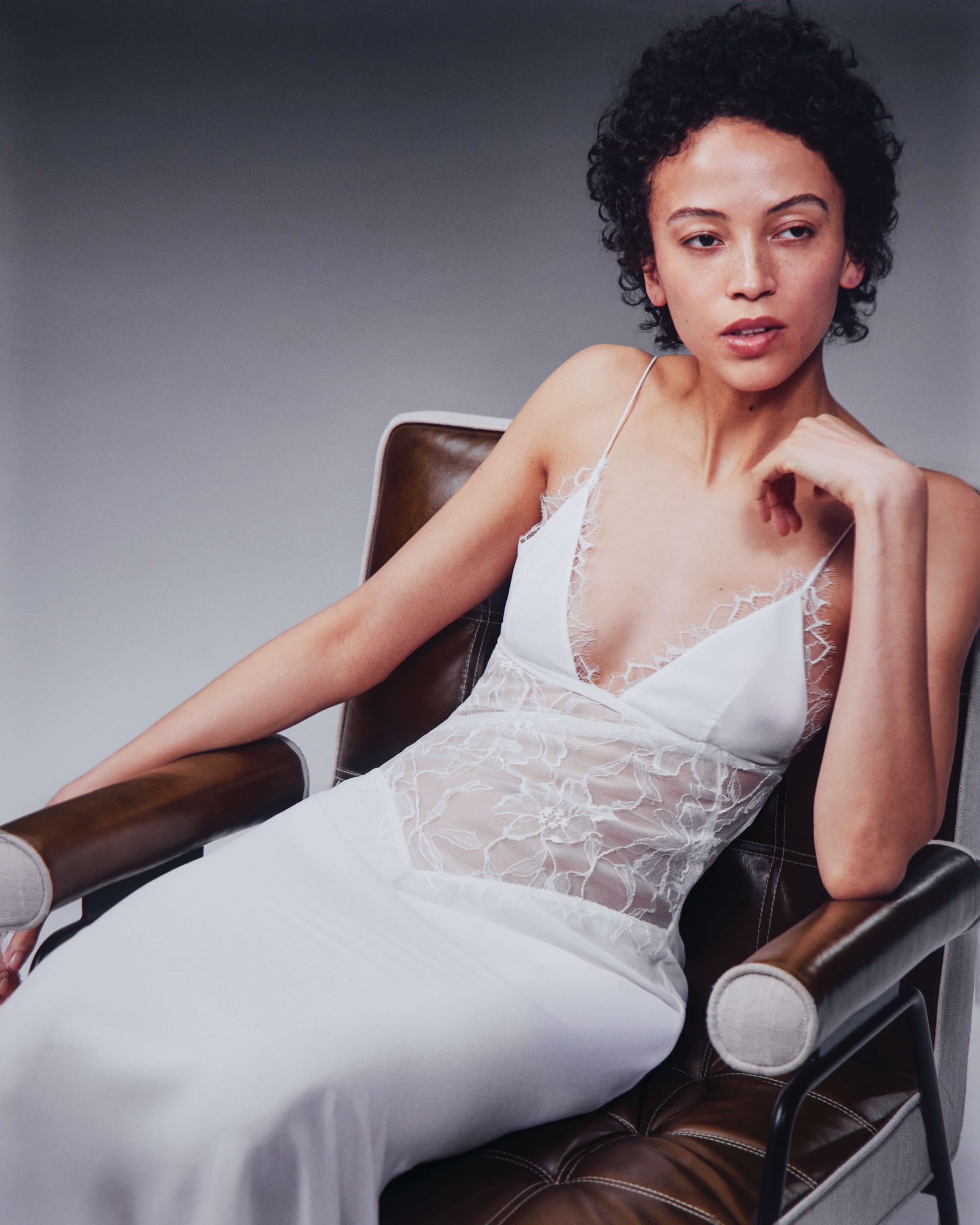 Less is more with Delphine, our super simple wisp of a dress. Detailed with a beautiful lace panelling and trim across the cups for a conceal-and-reveal interplay, Delphine fits elegantly through the body before flaring out.