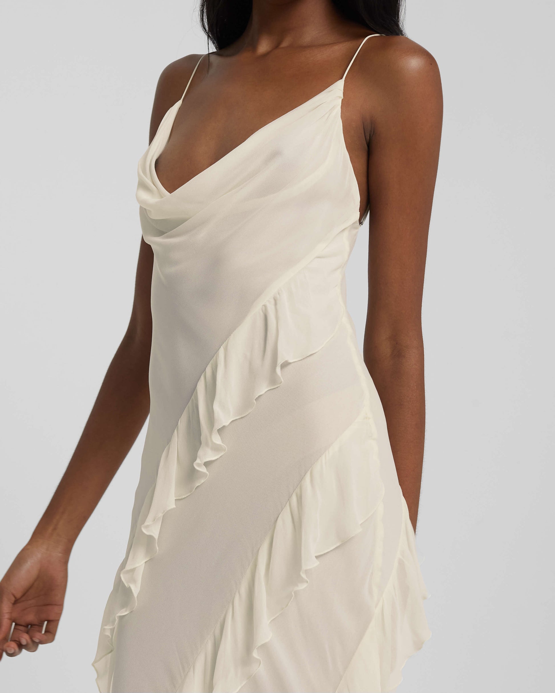 The Florencia has been cut on the bias, a technique which allows fabric to mould to the body. This draped effect is super flattering, and integral to our brand DNA. All of Our dresses are intentionally long, so customers can alter them to achieve their desired fit.