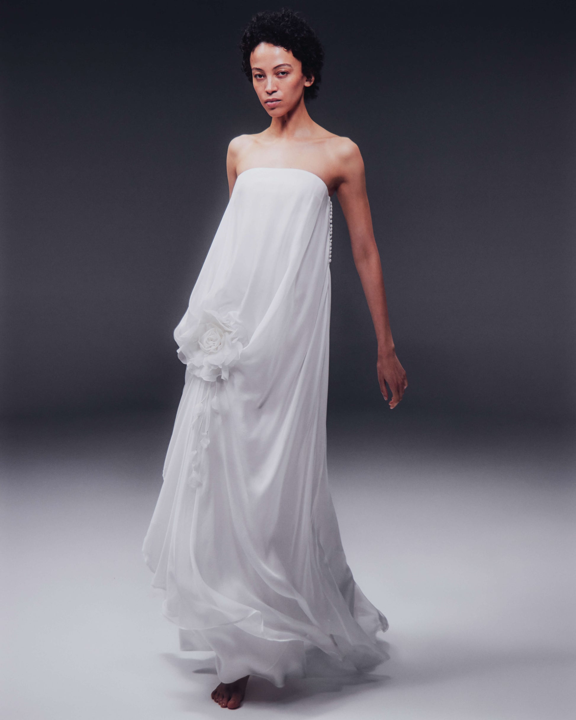 A delicate but daring affair. Hibiscus is an effortlessly undone silk column dress with hand-draped tulle overlay and a hand-stitched flower accessory. Let this statement piece speak for itself with minimal accessories and a great shoe.