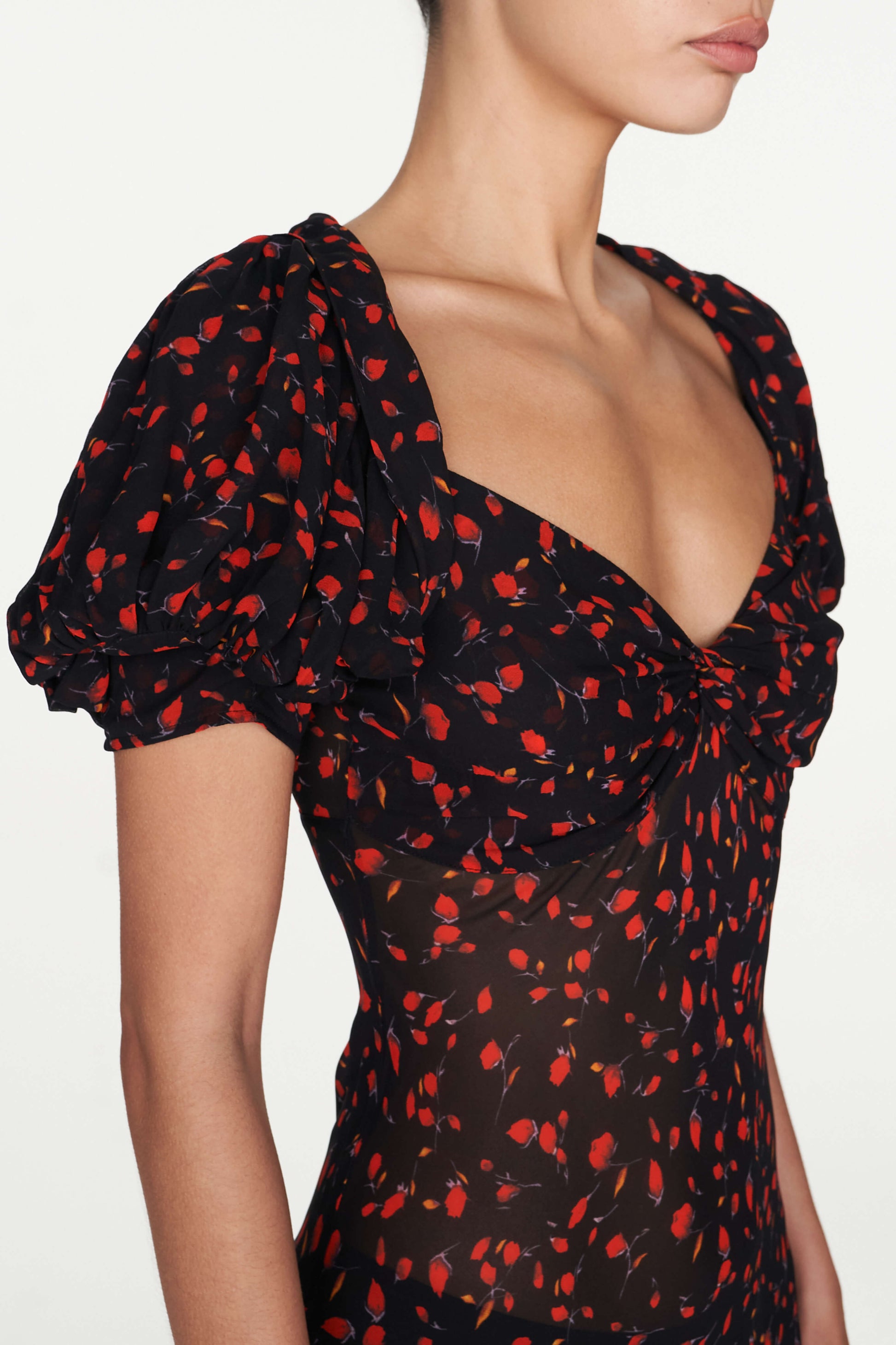 Cut to a slim fitting shape with exaggerated sleeves and a sweetheart neckline that is knotted across the front; the 'Magnolia' is feminine and floral with an edge of fierce.