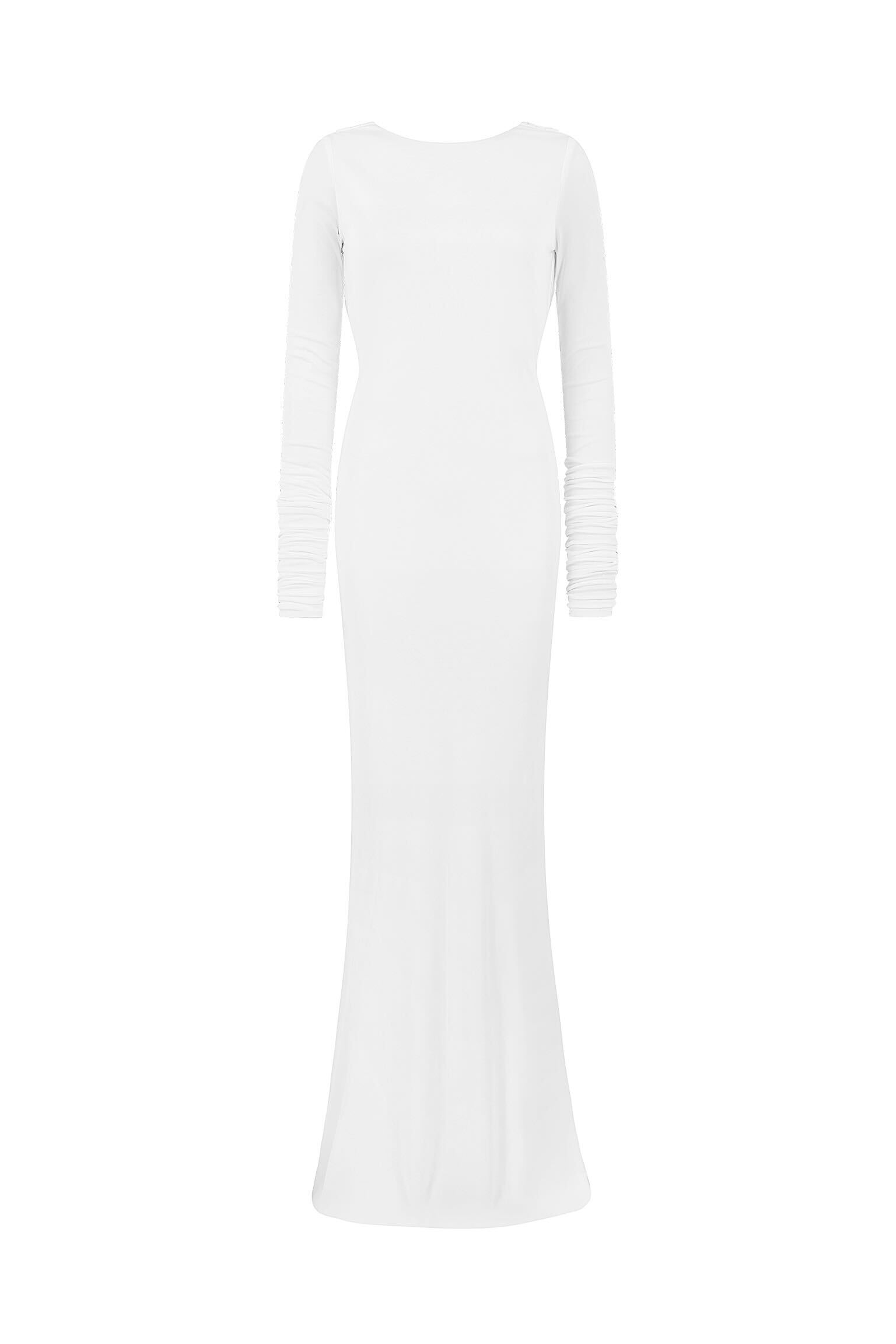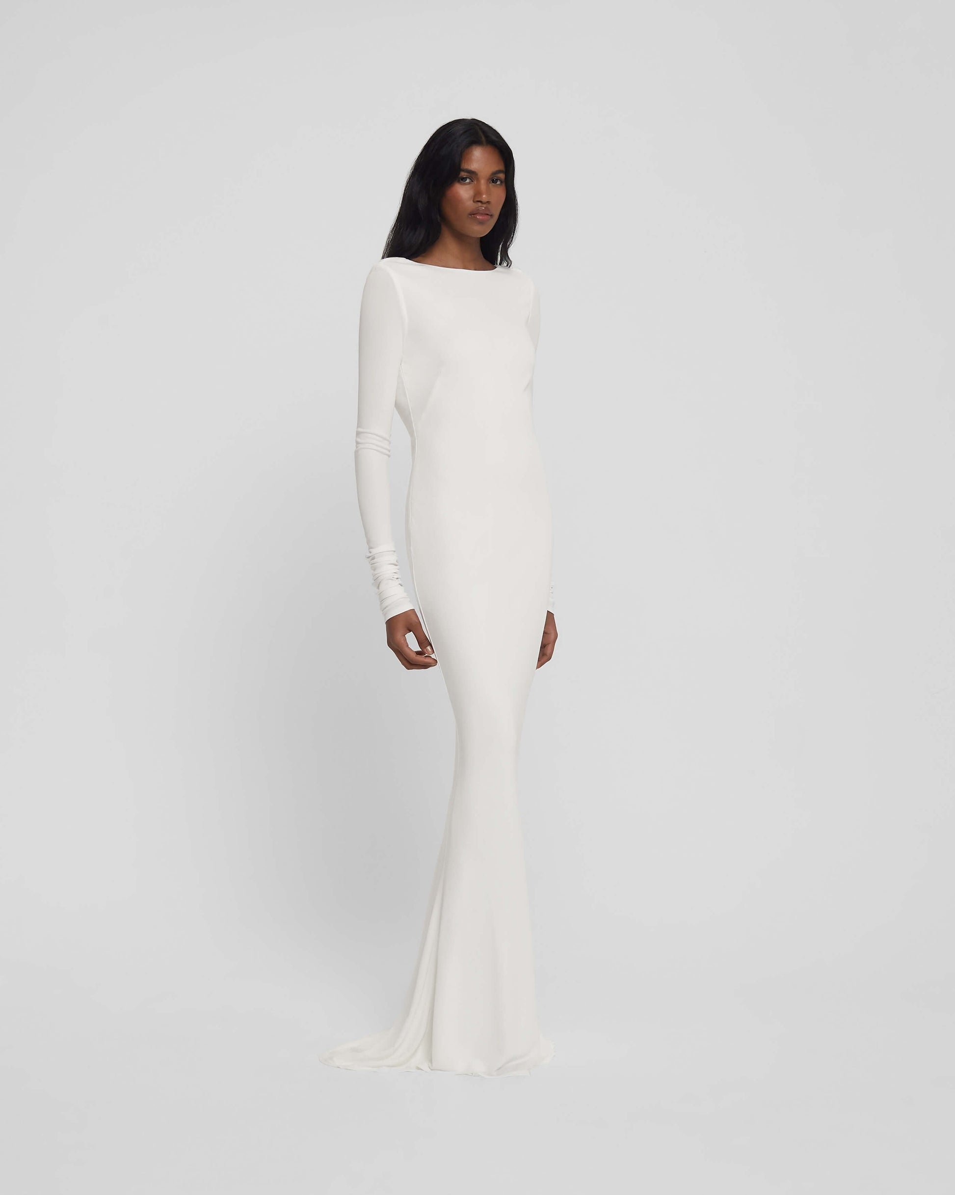 A high-grade double-layered jersey is masterfully draped to reveal and conceal. Rodeo may appear demure at first glance but with an elegant spin, she reveals a daringly cut low back.