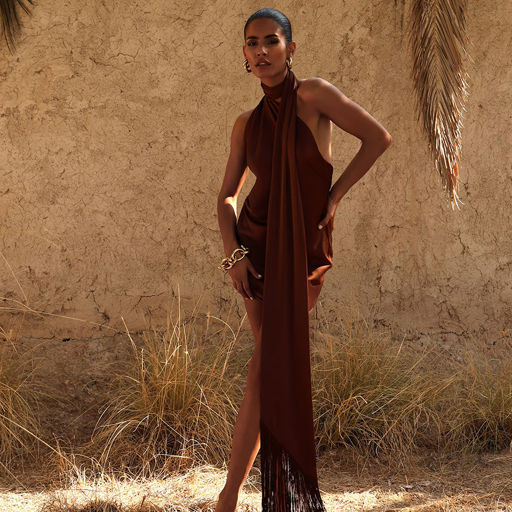A slinky one-shouldered mini dress with our signature cowl back, the Serafia in cocoa has an elegantly-tasselled scarf that you can wrap around you in ways that are only limited by your imagination.